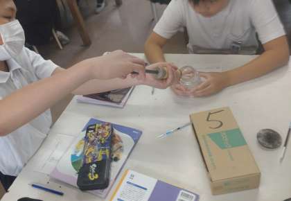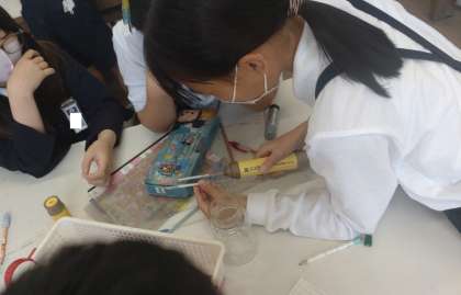 ものを燃やす前と後の空気の成分のちがいを「気体検知管」を使って数値を調べています。