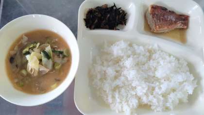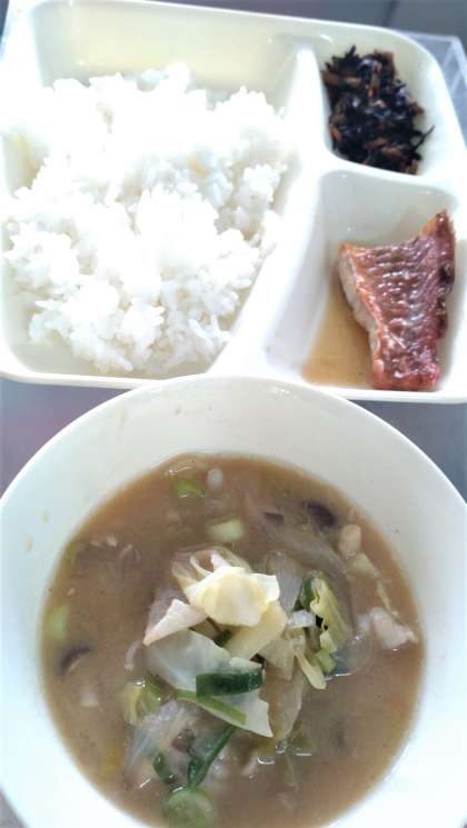 今日の給食は、あかうおのしょうゆだれかけ、豚汁、ひじきのいため煮、ごはん、牛乳です。