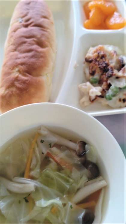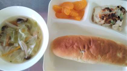 今日の給食は、マカロニグラタン、キャベツのスープ、みかん(缶)、おさつパン、牛乳です。