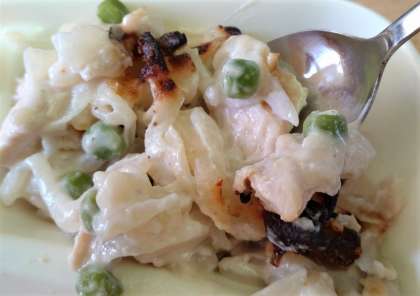 今日のマカロニグラタンは、鶏肉とたまねぎをいためたものに、クリーム、小麦粉、牛乳、グリンピース、マカロニを加え、チーズとパン粉をふって焼いています。