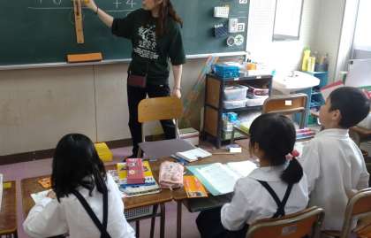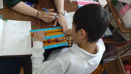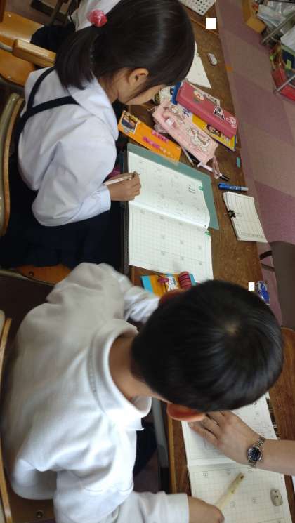 なかよし学級で算数の学習に取り組んでいます。2ケタ+2ケタの繰り上がりのあるひっ算の課題を解決しています。