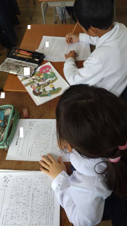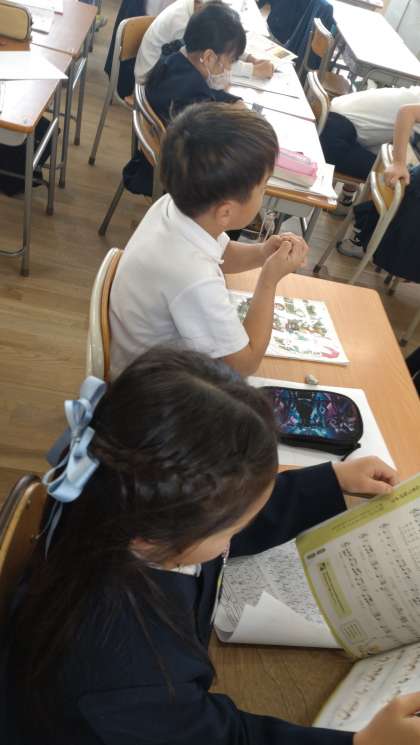 3年生が音楽の時間に、鑑賞の学習をしています。楽曲「♪トランペットふきの休日」のトランペットとホルンなどの楽器の音の特徴や音色の違いを感じ取りながら、感想を書いています。