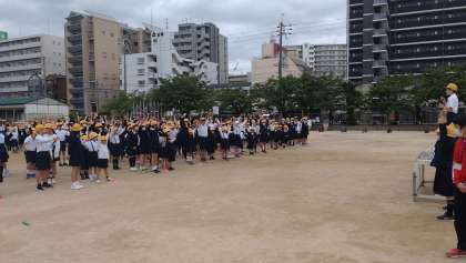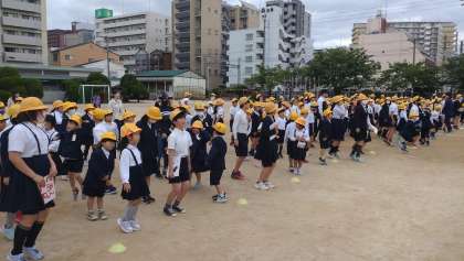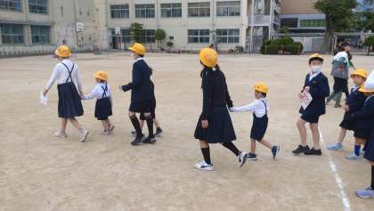 たてわり班で手をあげたりジャンプしたりとゲームを楽しみました。ゲーム終了後は、6年生が1年生と手をつないで教室に帰っていきます。