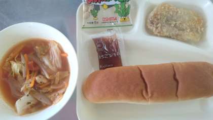 今日の給食は、一口とんかつ、ミネストローネ、豆こんぶ、コッペパン、いちごジャム、牛乳です。