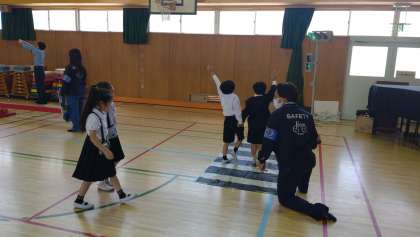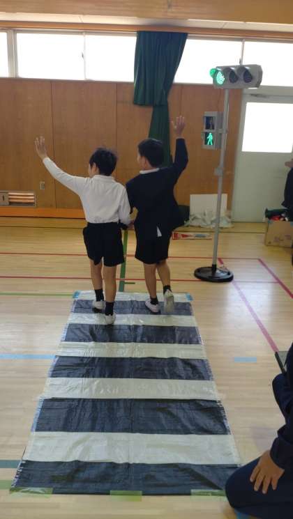 区役所から淀川区のセーフティ淀川の方々にも来ていただき指導していただきました。写真は、安全な歩道の歩き方や信号の待ち方などについて練習する子どもたちの様子です。