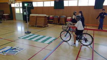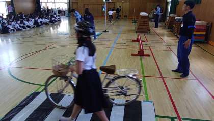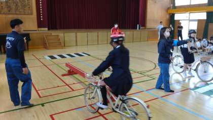 写真は、警察やセーフティ淀川の方からの説明をうけて、実際に自転車に乗って安全な乗り方を体験している子どもたちの様子です。