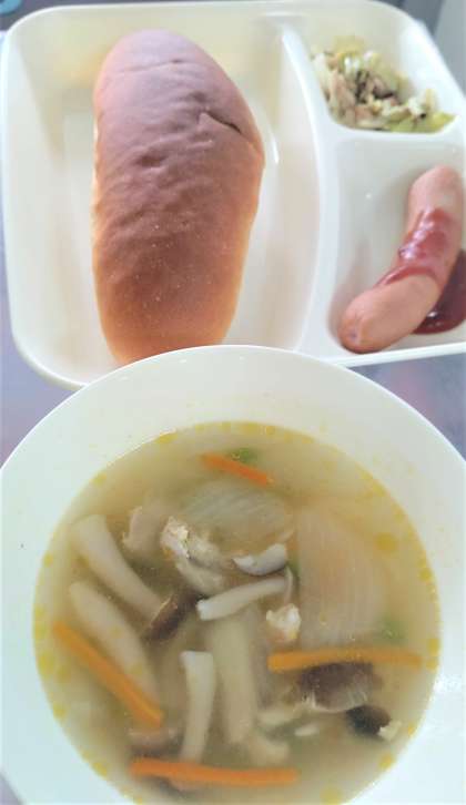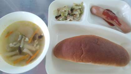 今日の給食は、ウインナーのケチャップソース、スープ、焼きツナキャベツ、黒糖パン、牛乳です。