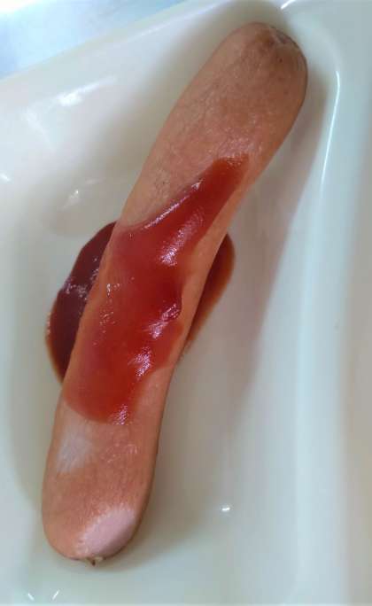 今日の給食では、ゆでたウインナーソーセージにケチャップ味のソースをかけています。