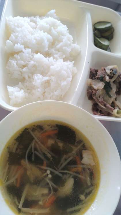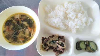 今日の給食は、プルコギ、とうふとわかめのスープ、きゅうりの甘酢づけ、ごはん、牛乳です。
