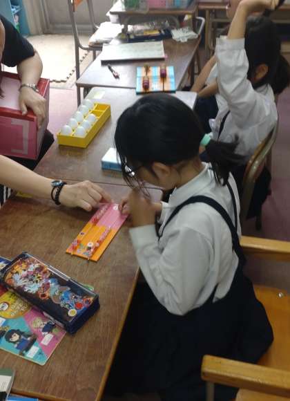 なかよし学級の2年生が算数の学習に取り組んでいます。繰り下がりのあるひき算の課題を具体物を使って解決しています。