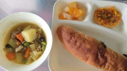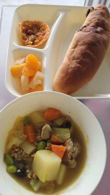 豚肉と野菜のカレースープ煮、変わりピザ、ミックスフルーツ(缶)、レーズンパン、牛乳です。