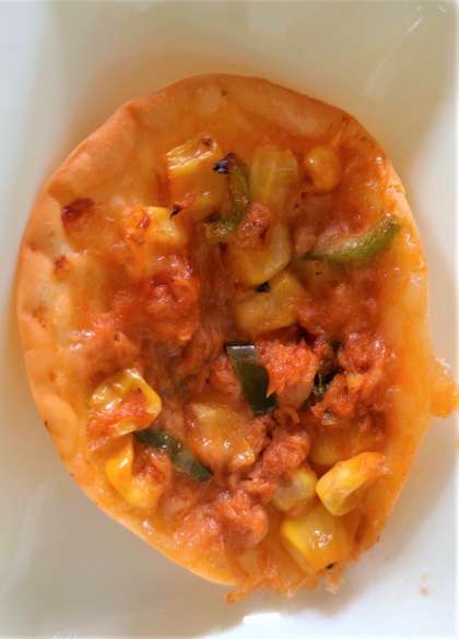 給食の代わりピザは、ぎょうざの皮に、ツナ、コーン、ピーマン、ピザソース、チーズを混ぜ合わせた具をのせ、焼き物機で焼いています。