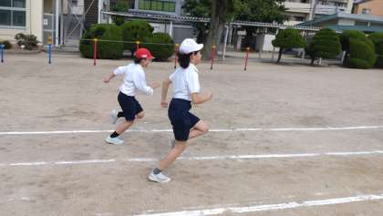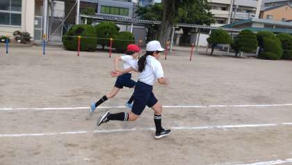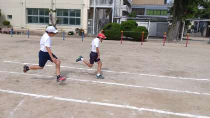 6年生が新体力テストの50メートル走に取り組んでいます。子どもたちは、真剣に全力疾走しています。