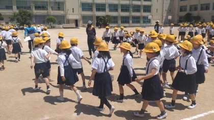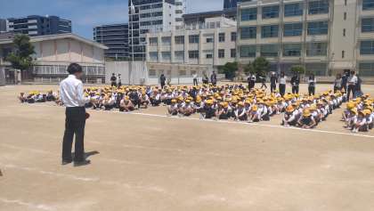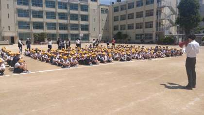 避難訓練が行われました。子どもたちは。「おすしも」の合言葉をもとに、スムーズに地震による避難をすることができました。この後、津波からの避難のために高所移動(校舎の三階以上)に取り組みました。写真は、運動場への避難から高所に移動する時の様子です。