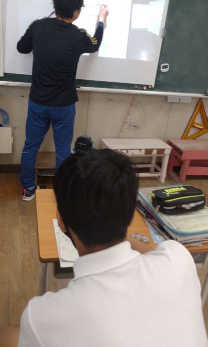 なかよし学級の6年生が算数の学習の学習に取り組んでいます。この時間は、分数と整数のかけ算、わり算について学習しています。