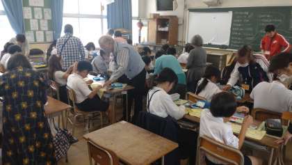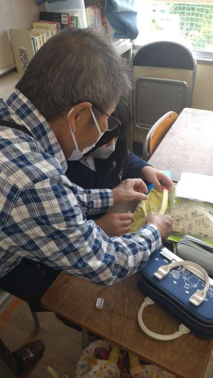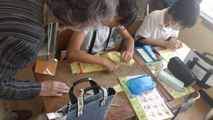 老人会の方に来ていただき5年生との世代間交流が行なわれました。家庭科の裁縫の学習で、いろいろな縫い方を教えていただきました。