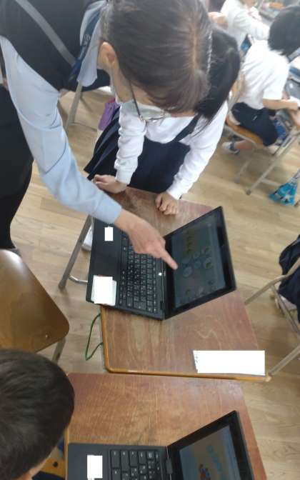 1年生が一人一台端末PCを使ってプログラミング学習に取り組みました。ICT支援員さんの支援をうけて、子どもたちは熱心にプログラミングのアプリケーションソフトを操作していました。