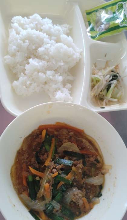 今日の給食は、マーボーはるさめ、チンゲンサイともやしの甘酢あえ、まっ茶大豆、ごはん、牛乳です。