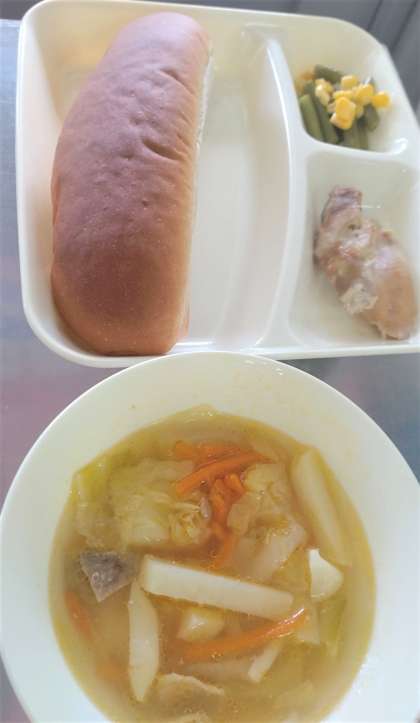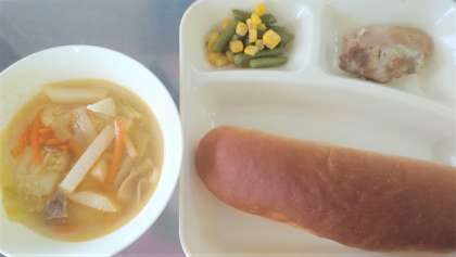 今日の給食は、鶏肉のガーリック焼き、スープ、さんどまめとコーンのサラダ、黒糖パン、牛乳です。