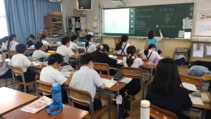 6年生が学年を3分割して算数の学習に取り組んでいます。分数をかけることの意味と計算の仕方を学んでいます。