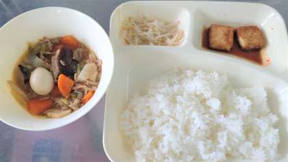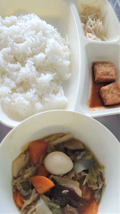 今日の給食は、八宝菜、あつあげのピリ辛じょうゆかけ、もやしの中華あえ、ごはん、牛乳です。