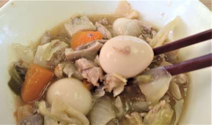 給食では、ぶた肉、うずら卵、キャベツ、たまねぎ、にんじん、たけのこ、ピーマンしいたけを使っています。