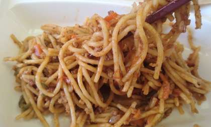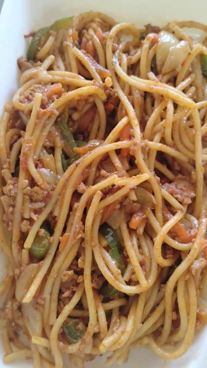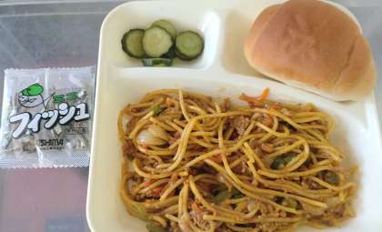 今日の給食は、カレースパゲッティ、きゅうりのピクルス、ミニフィッシュ、ミニコッペパン、牛乳です。