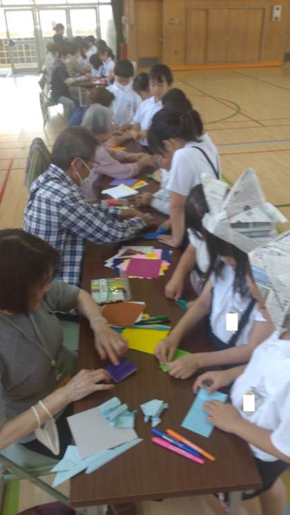 14日(金)に、老人会の方たちと2年生のお手紙での世代間交流がありました。各コーナーで、子どもたちは丁寧にいろいろな折り紙の折り方を教えてもらいました。