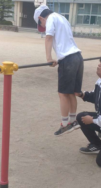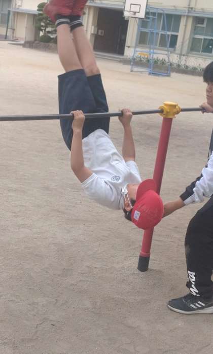 3年生が体育で鉄棒運動に取り組んでいます。写真は、「前回り下り」に挑戦している子どもたちの様子です。