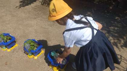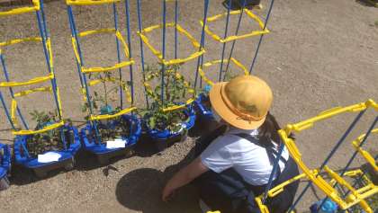 1・2年生の子どもたちが毎朝、あさがおやトマトの水やりをしています。葉を大きくなって植物の成長をしっかりと観察しています。写真は、6/14の子どもたちの様子です。
