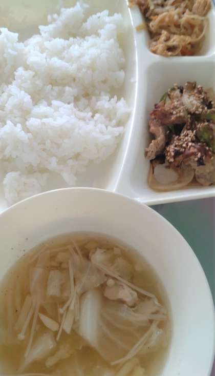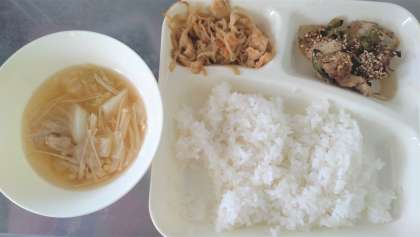 今日の給食は、豚肉のごまみそ焼き、すまし汁、切干しだいこんのいため煮、ごはん、牛乳です。
