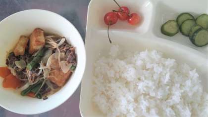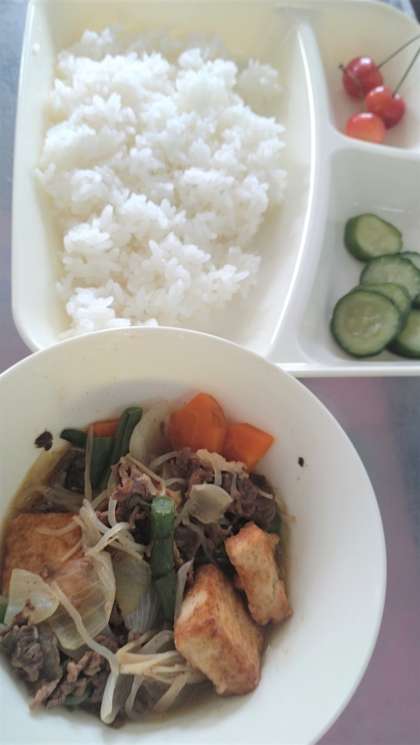 今日の給食は、牛肉と野菜のいため煮、きゅうりのしょうがづけ、さくらんぼ🍒、ごはん、牛乳です。