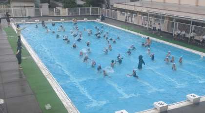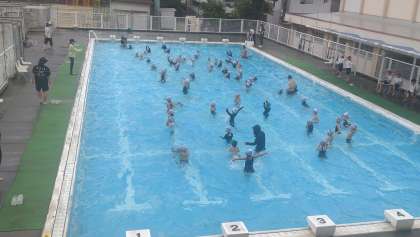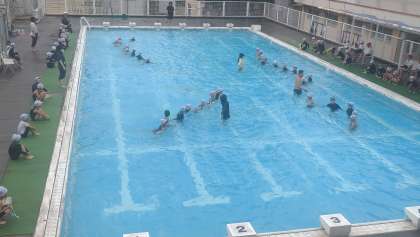 1年生がプール水泳に取り組みました。低学年は、「水の中を移動する運動遊び」と「もぐる・浮く運動遊び」を行うことで、水中での基本的な動きを身に付けていきます。写真は、 水慣れで音楽に合わせてダンスを踊ったり、友だちと手をつないでプールを移動している様子です。