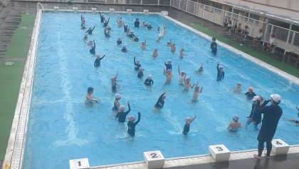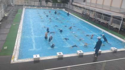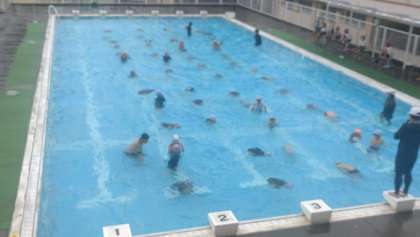 写真は、3年生のプール水泳の様子です。「もぐる・浮く運動」を中心に取り組んでいます。