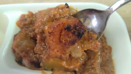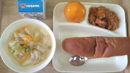 今日の給食は、かぼちゃのミートグラタン、鶏肉と野菜のスープ、みかん(冷)、黒糖パン、牛乳です。