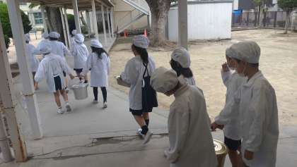 下段の写真は、頑張って食缶などを運んでいる3年生の給食当番の子どもたちの様子です。