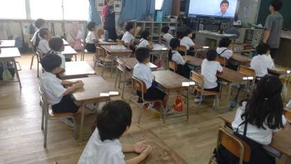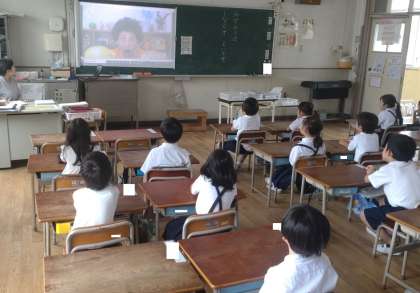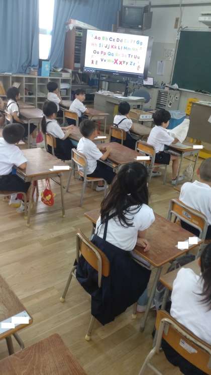 火曜日と水曜日の朝は「英語モジュール」の時間です。英語に慣れ親しむために映像や音楽を使って活動しています。写真は、英語の「あいさつ」や「アルファベット」の歌を合唱している1年生の子どもたちの様子です。