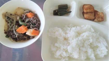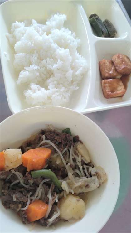 今日の給食は、肉じゃが、あつあげのみそだれかけ、オクラのおかかいため、ごはん、牛乳です。