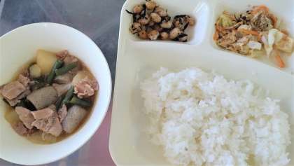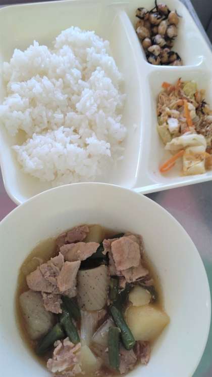 今日の給食は、豚肉とじゃがいもの煮もの、ひじき豆、ささみと野菜のごまみそ焼き、ごはん、牛乳です。