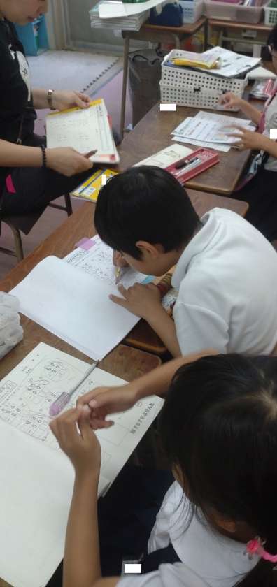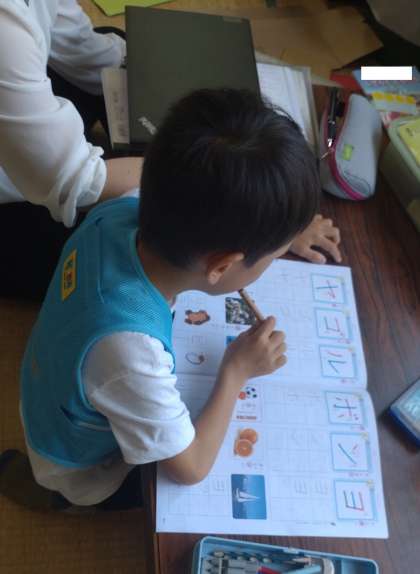 なかよし学級で子どもたちがそれぞれの学習課題に取り組んでいます。国語はカタカナや算数では2けた−2けたのたし算、ひき算などの練習問題を熱心に取り組んでいます。