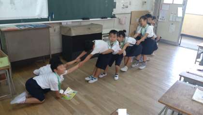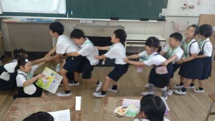 1年生が国語で物語文「おおきなかぶ」の学習をしています。場面の様子や登場人物の行動などの内容をとらえて、音読を楽しむ学習です。写真は、子どもたちがグループで協力して劇で物語を表現している様子です。