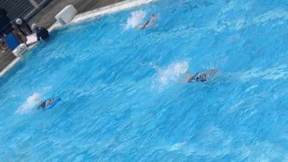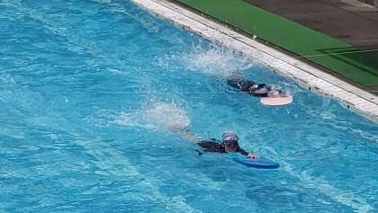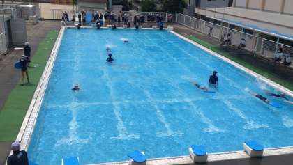 5年生がプール水泳に取り組んでいます。25mをビート板を使ってバタ足で泳いでいます。