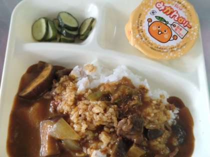今日の給食は、夏野菜のカレーライス🍛、きゅうりのサラダ🥒、みかんゼリー🍊、牛乳です。