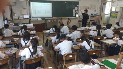 2年生が算数で「水の かさの たんい」を学習しています。この時間は、水筒に入る水の体積を dL を使って表す学習に取り組んでいます。