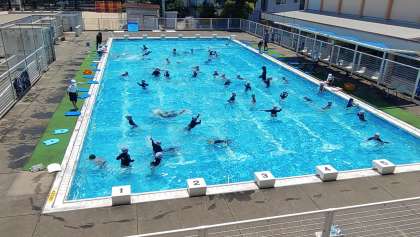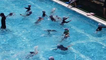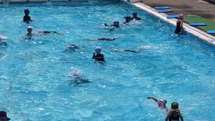 今日も子どもたちは元気にプール水泳に取り組んでいます。写真は、2年生が「宝探し」のゲームをしているところです。ゲームの「水遊び」をする中で、子どもたちは、水中を移動することや浮くことなどを学んでいます。