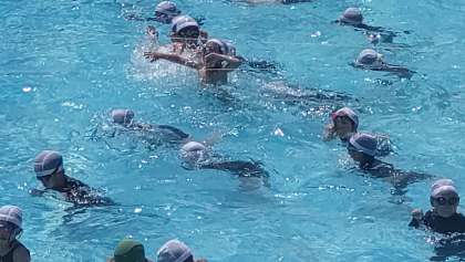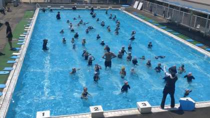 昨日より、夏休みのプール・図書館開放が始まっています。今日もたくさんの子どもたちが参加しています。写真は、初日に参加した低学年の子どもたちの様子です。