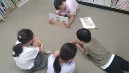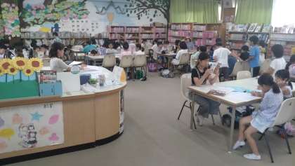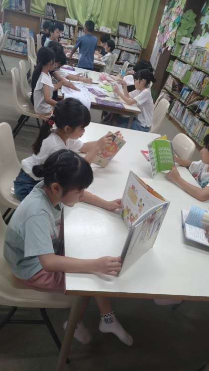 図書館開放も行われています。写真は、初日の図書館での子どもたちの様子です。たくさんの子どもたちが参加しています。