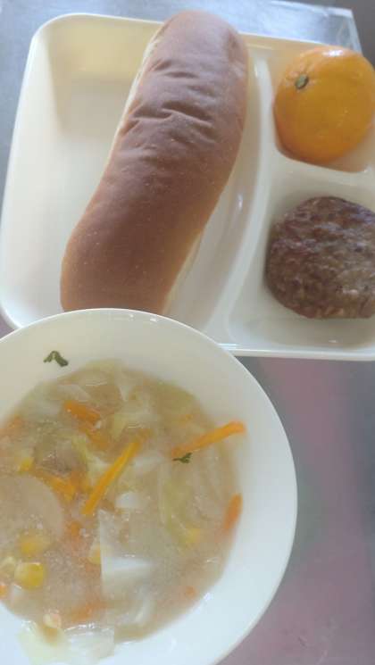 今日から給食がはじまりました。今日の給食は、焼きハンバーグ、ケチャップ(袋・焼きハンバーグ)、豆乳スープ、みかん(冷)、パン、牛乳です。
