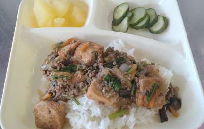 今日の給食は、マーボーあつあげ丼、あっさりきゅうり🥒、りんご🍎(カット缶)です。