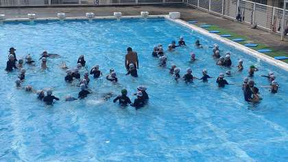写真は、2年生が、グループで協力しながら浮く練習をしている様子です。子どもたちは、とても熱心に取り組んでいます。